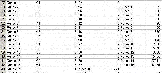 Nehmen wir mal als Beispiel die tc 'Runes 17'. Diese enthält die tc 'r33',was der Rune Zod entspricht sowie die tc 'Runes 16'. Die relativen Häufigkeiten sind 1 für die 'r33' und 82721 für die 'Runes 16'. D.h. wenn ursprünglich die tc 'Runes 17' ausgewählt wurde, dann ist die Wahrscheinlichkeit, daß eine Zod fällt 1/82722 und daß die 'Runes 16' ausgewählt wird 82721/82722. Die 'Runes 16' enthält dann wiederum die tc 'r32' (Cham) und die 'r31' (Jah) und auch die 'Runes 15'. So geht es dann weiter bis zum Schluß eine 'El' fällt. So sieht also in einem vereinfachten Beispiel die rekursive Struktur der Schatzklassen aus. Dazu auch ein Bild: